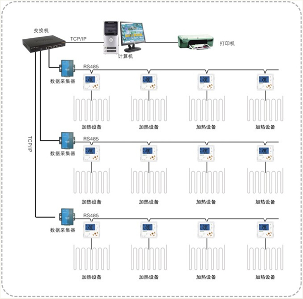 軟件系統與采集器的通訊標準為TCP/IP通訊方式。采集器與采暖智能溫度控制器的通訊采用平衡傳輸的RS485串行總線通訊標準,通訊距離遠,抗干擾能力強。 其中,每—臺電采暖智能溫度控制器獨立完成電伴熱設備的各種狀態的數據采集和控制任務。上位機軟件系統以周期詢問的方式與數據采集器實現穩定的網絡通訊,數據采集器將采集到智能溫度控制器的狀態上傳至上位機管理中心。上位機軟件系統又將采集到智能溫度控制器的實時狀態進行邏輯分析,并將 佳控制結果通過信號控制發送至智能溫度控制器, 終實現自動化控制。
